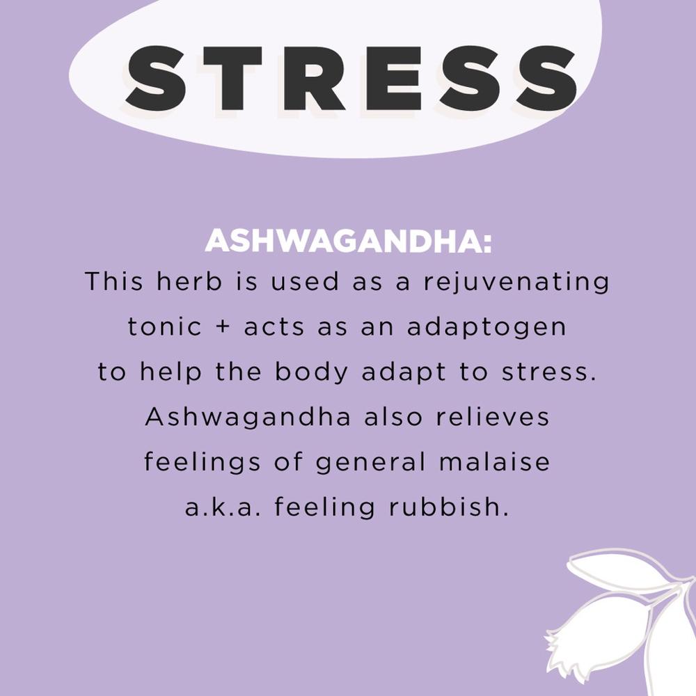 ASHWAGANDHA: Traditionally used in Ayurvedic medicines as a rejuvenating tonic. It is an adaptogen to help the body adapt to stress, and relieves feelings of general malaise and debility
